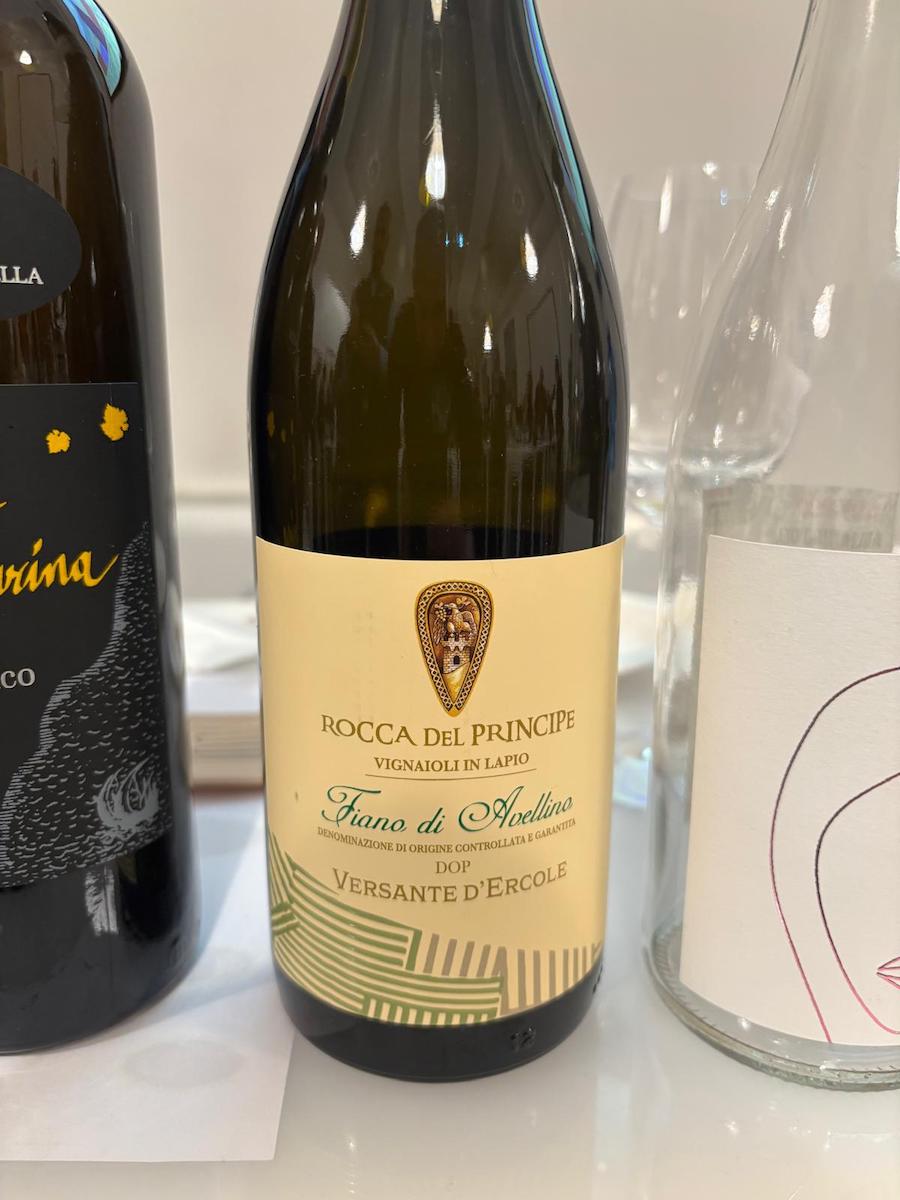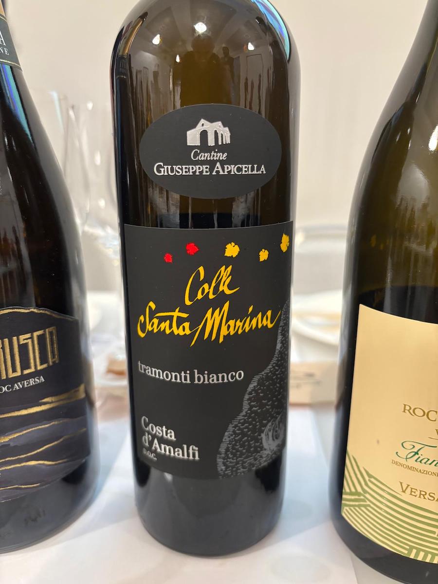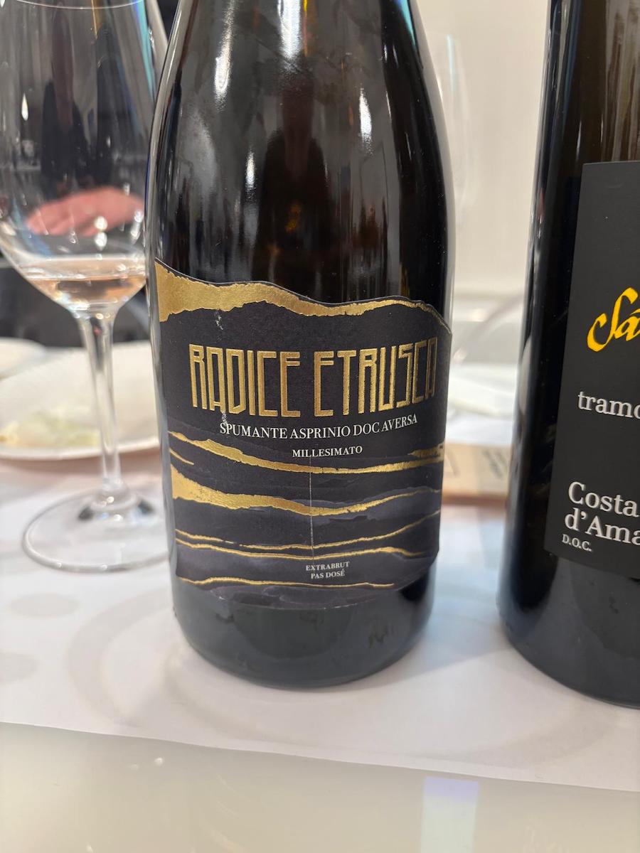 Le mozzarelle ingentiliscono il rustico, selvaggio e agrumato Asprinio, che dopo 40 mesi sui lieviti inizia ad evidenziare alcuni toni più morbidi, in primis di cedro candito. Passiamo al Costa d’Amalfi, sottozona Tramonti, la più interna della denominazione, che deve il suo nome all’azione del vento freddo del nord che spesso spira in zona; un’enclave che ha conservato anche vitigni rarissimi, come testimonia il blend in assaggio, dove spiccano i rari Ginestra e Pepella. Il primo un semi aromatico mentre la Pepella deve il suo nome al suo grappolo che soffre di acinellatura, quindi pochissimi acini molto concentrati.